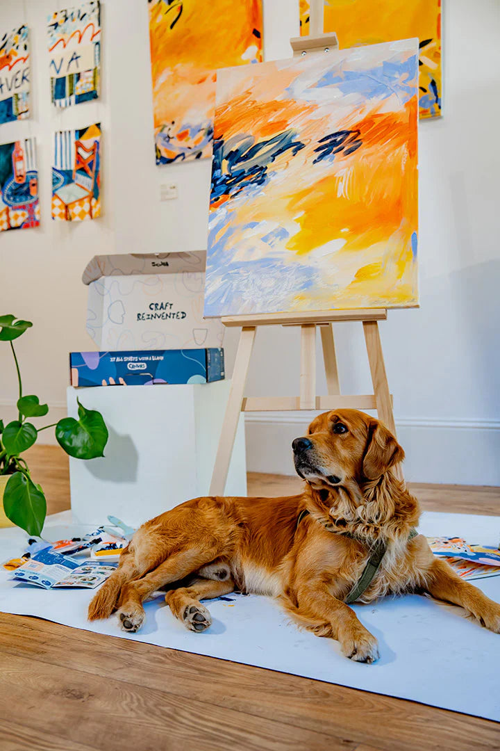 Ein typischer Tag beginnt immer mit Vitaminen, Kaffee und einem Spaziergang mit Gibson (meinem Golden Retriever) - daran besteht absolut kein Zweifel. Gibson würde den Morgen nicht anders zulassen. Ich habe das Glück, eine gute Work-Life-Balance zu haben und meine eigenen Stunden festzulegen. Ich bin in der ersten Tageshälfte viel produktiver - das Malen findet normalerweise zwischen 9 und 1 statt.