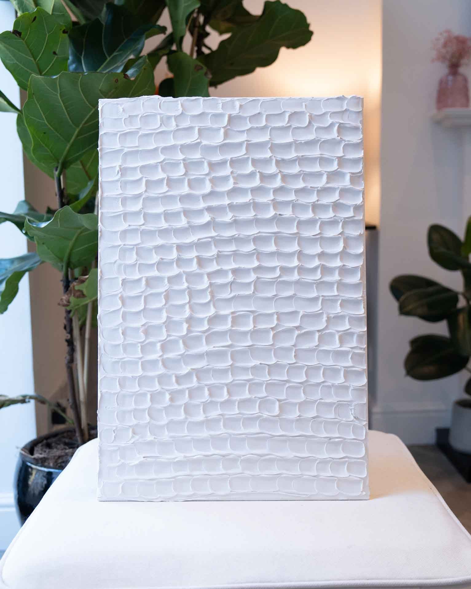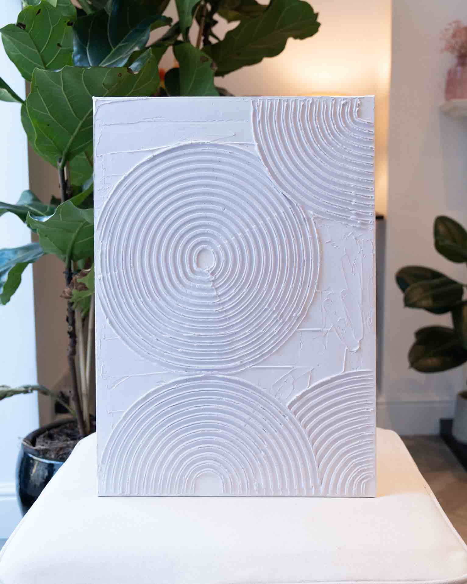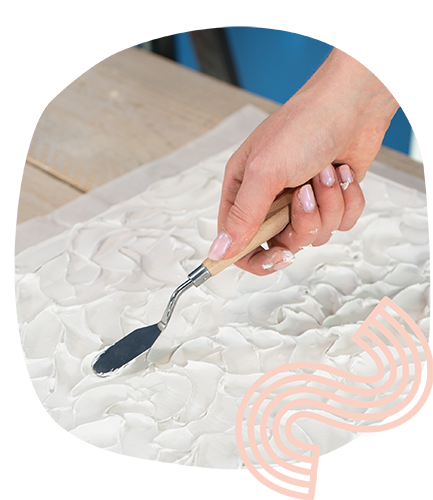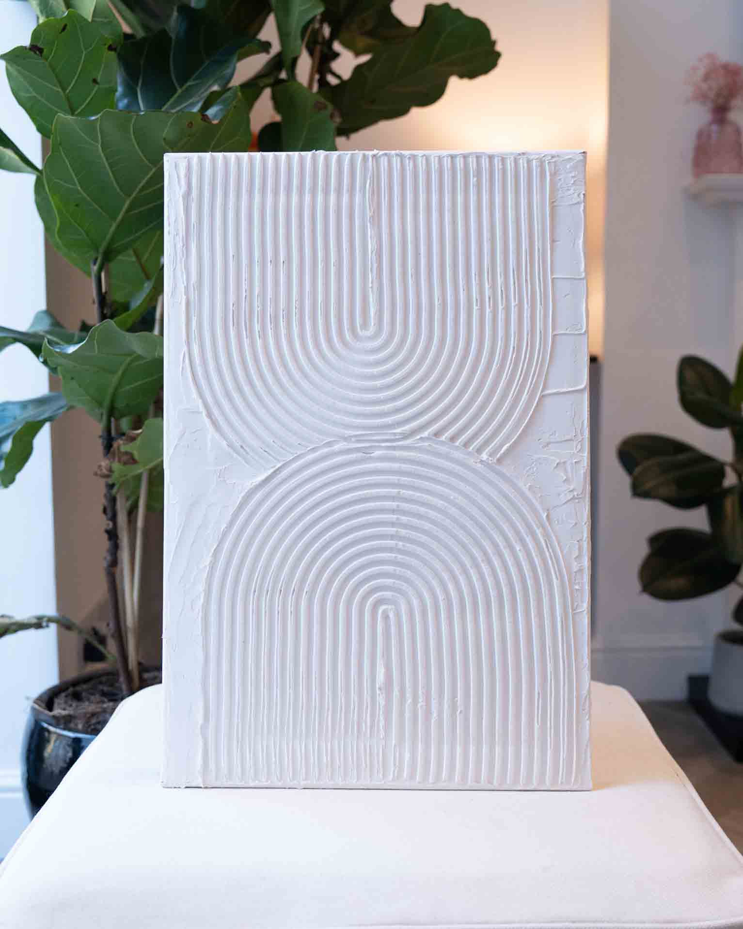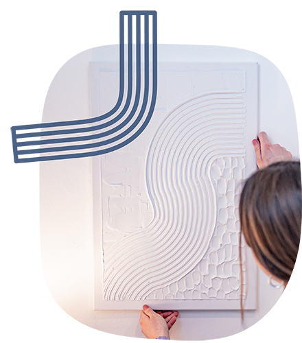 Formen Sie skulpturale Linien und texturierte Tiefe mit dem gezahnten Kamm und dem Spachtelwerkzeug. Schichten Sie erdige Pigmente auf die ausgehärtete Paste, um ein warmes, architektonisches Werk zu schaffen, das jeden Raum mit organischem Charme aufwertet.